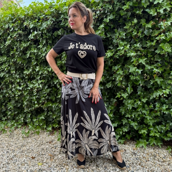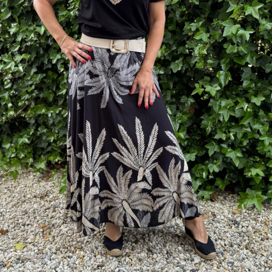 Deze zwierige, lange rok is een must-have voor het voorjaar en de zomer. De diepe zwarte kleur wordt stijlvol gecombineerd met een opvallende palmbladprint in beige tinten. Dankzij de soepele stof en de elastische tailleband zit de rok niet alleen comfortabel, maar geeft hij ook een flatterend silhouet. Combineer met een luchtige blouse of een basic top voor een moeiteloos chique look. Draag er een leuke riem bij en je outfit is compleet. Ideaal voor een dagje strand, een terrasje of een zomerse citytrip.