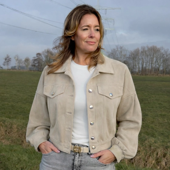 Dit beige suedine jasje "Liana" is een stijlvolle toevoeging aan elke outfit. Het jasje heeft een klassieke knoopsluiting en is verkrijgbaar in maat S-M en L-XL. Perfect voor zowel casual als formele gelegenheden. | Luxe suedine materiaal | Klassieke knoopsluiting | Verkrijgbaar in twee maten