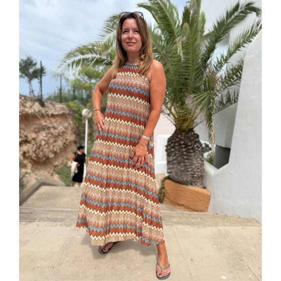 Deze kleurrijke maxi dress van Biba is een echte blikvanger! De jurk is uitgevoerd in een luchtige plisséstof met een speelse zigzagprint in koper, blauw, beige en goud. Dankzij het lurex draadje heeft de jurk een subtiele glans die perfect is voor zonnige dagen én feestelijke avonden. De halterhals met striksluiting geeft een vrouwelijke en zomerse uitstraling.