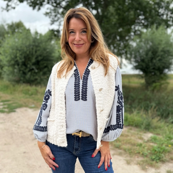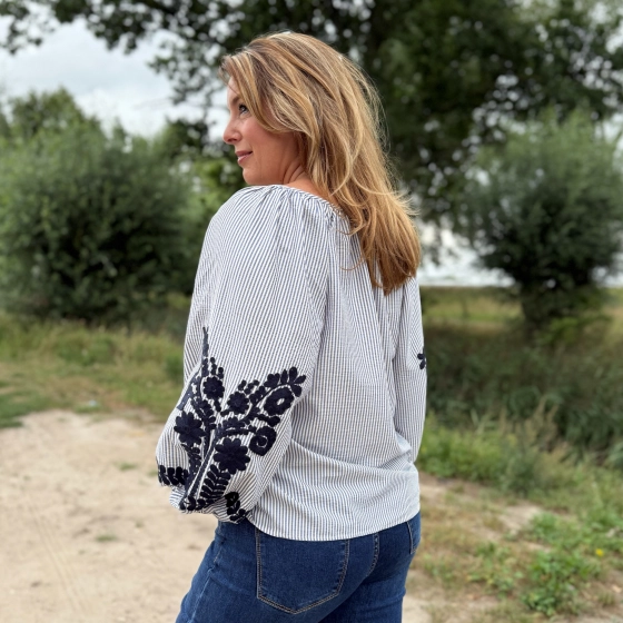 Op zoek naar een luchtige blouse met een bohemian uitstraling? De Ja Millenium blouse is een echte eyecatcher. Deze top is gemaakt van 100% katoen en draagt heerlijk comfortabel. De blauwe streep in combinatie met de ton-sur-ton borduursels op de mouwen en halslijn geeft een speelse, etnische look. De licht gepofte mouwen, de wijde halslijn met V-split en de geborduurde details zorgen voor een vrouwelijke en trendy uitstraling.