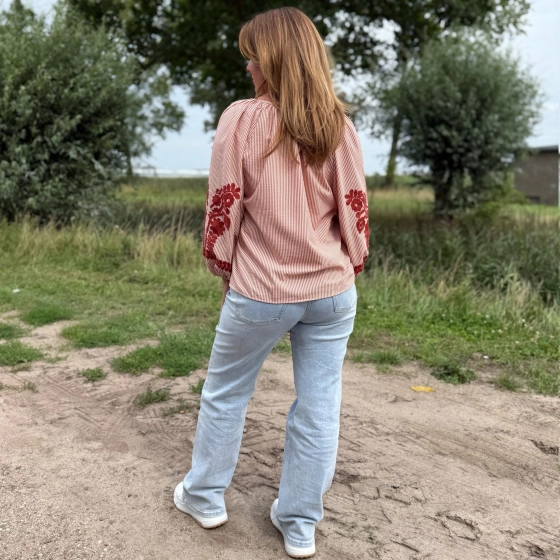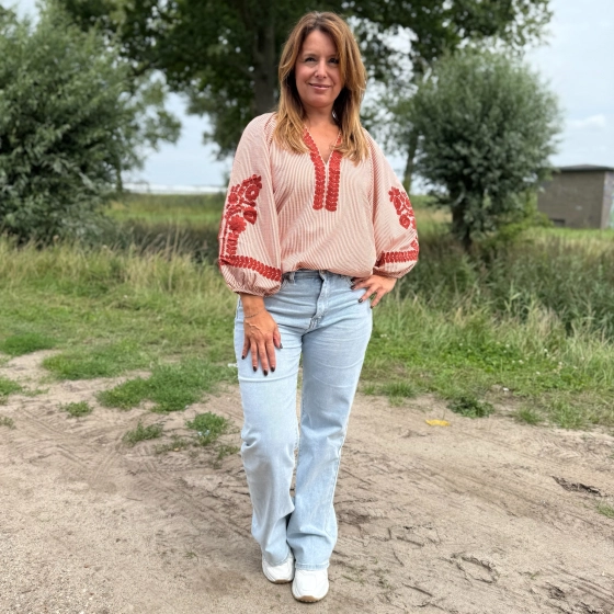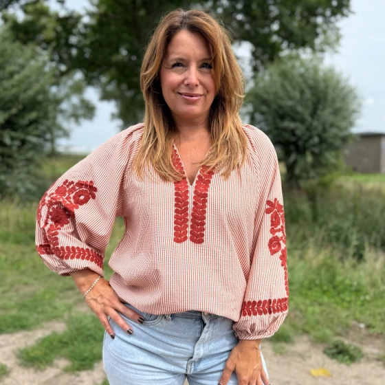 Op zoek naar een luchtige blouse met een bohemian uitstraling? De Ja Millenium blouse is een echte eyecatcher. Deze top is gemaakt van 100% katoen en draagt heerlijk comfortabel. De roodbruine streep in combinatie met de ton-sur-ton borduursels op de mouwen en halslijn geeft een speelse, etnische look. De licht gepofte mouwen, de wijde halslijn met V-split en de geborduurde details zorgen voor een vrouwelijke en trendy uitstraling.
