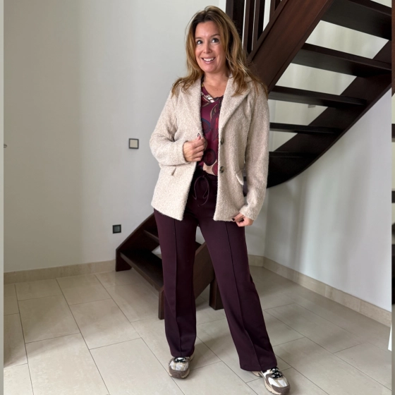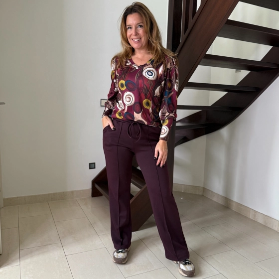 Met de broek Emily kies je voor stijl, comfort en veelzijdigheid. Burgundy is dé trendkleur van 2025 en laat zich gemakkelijk combineren met natuurlijke tinten zoals ivoor, beige en groen, maar ook met klassiek zwart of denim.