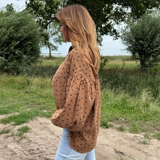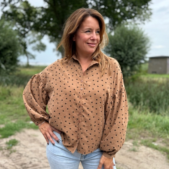 Op zoek naar een comfortabele én trendy blouse? Deze camelkleurige blouse van het merk Timeless is precies wat je nodig hebt. De zwarte hartjesprint zorgt voor een speelse, vrouwelijke look, terwijl de zachte stof heerlijk aanvoelt op je huid. Dankzij de samenstelling van 90% polyester en 10% polyamide is de blouse licht, soepel en prettig draagbaar – de hele dag door.