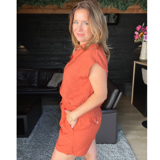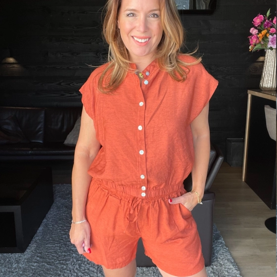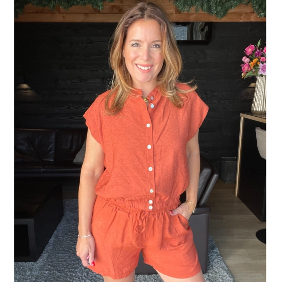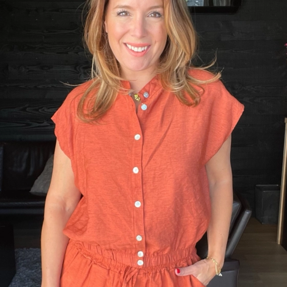 Ontdek deze stijlvolle terracotta dames top met knoopsluiting en een comfortabele elastische onderkant. Gemaakt van een luchtige mix van 15% linnen, 65% viscose en 20% nylon, waardoor de top heerlijk draagt op warme zomerdagen. De korte mouwen en de elegante knoopsluiting geven de top een moderne uitstraling, terwijl het elastiek aan de onderzijde zorgt voor een perfecte pasvorm en een speels blousend effect. Combineer deze top moeiteloos met de bijpassende broek voor een complete en trendy outfit. Ideaal voor een dagje uit, vakantie of een casual look!