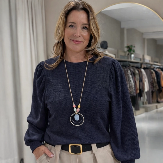 De donkerblauwe crêpe top met kettingdetail is een stijlvolle keuze voor elke gelegenheid. De top heeft lange mouwen en een comfortabele ronde hals, perfect voor een casual of formele look. De soepele crêpe stof zorgt voor een elegante pasvorm en voegt een vleugje chic toe aan je outfit. | Stijlvolle kettingdetail | Comfortabele pasvorm | Geschikt voor diverse gelegenheden