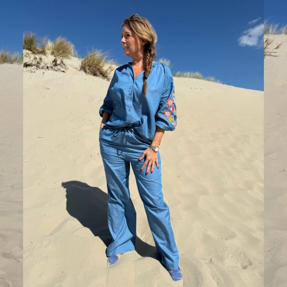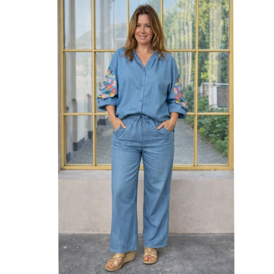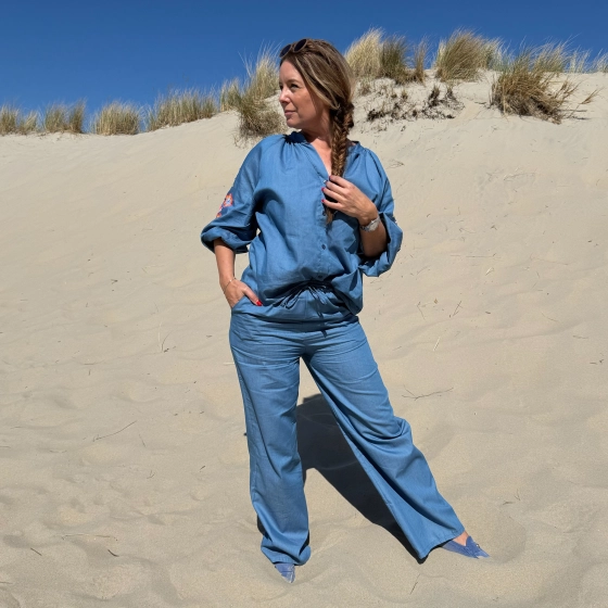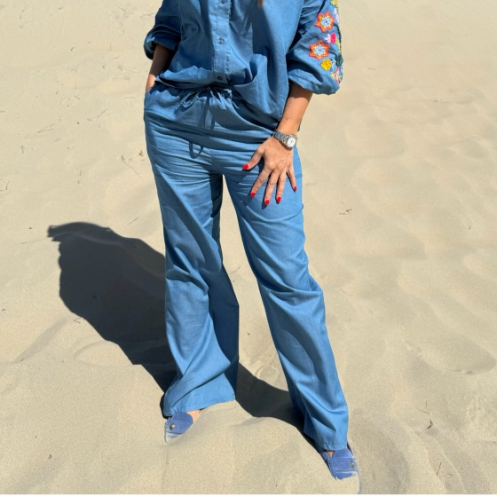 De lichtblauwe Tencel broek Nicole is perfect voor een casual-chique look. De broek heeft een strikkoordje en twee handige steekzakjes aan de voorkant. Dankzij de valt-op-maat pasvorm zit hij comfortabel bij elke gelegenheid. Duurzaam, zacht materiaal | Stijlvol strikkoordje detail | Praktische steekzakjes voor essentiële spullen.