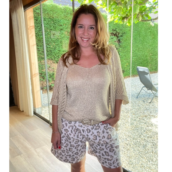 Dit goud opengewerkte vestje is een perfecte toevoeging aan jouw voorjaars- en zomerlook. De luchtige breistructuur, korte mouwen en relaxte pasvorm maken dit vestje heerlijk om te dragen op warmere dagen. Het vestje is gemaakt van een comfortabele, soepele stof met een innerlijke glans en voelt zacht aan op de huid.