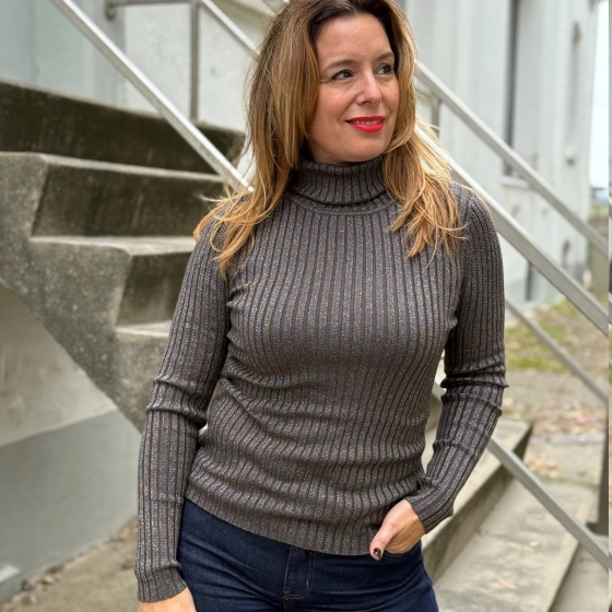 Dit Gemma Ricceri lurex coltruitje in grey/brown is dé perfecte mix van stijl en comfort. De fijne ribstructuur en het subtiele lurex draadje zorgen voor een lichte glans, waardoor dit truitje net dat beetje extra uitstraling geeft.