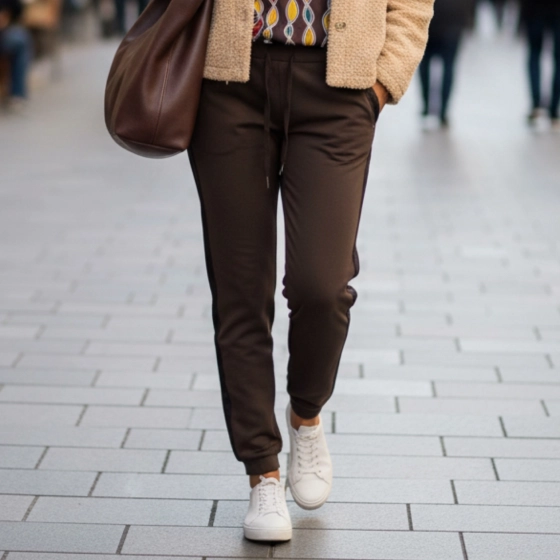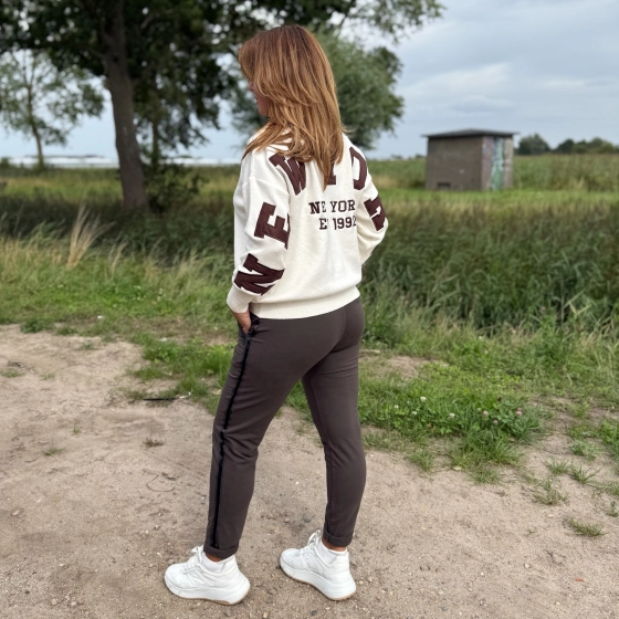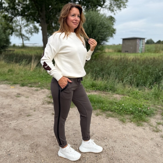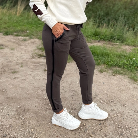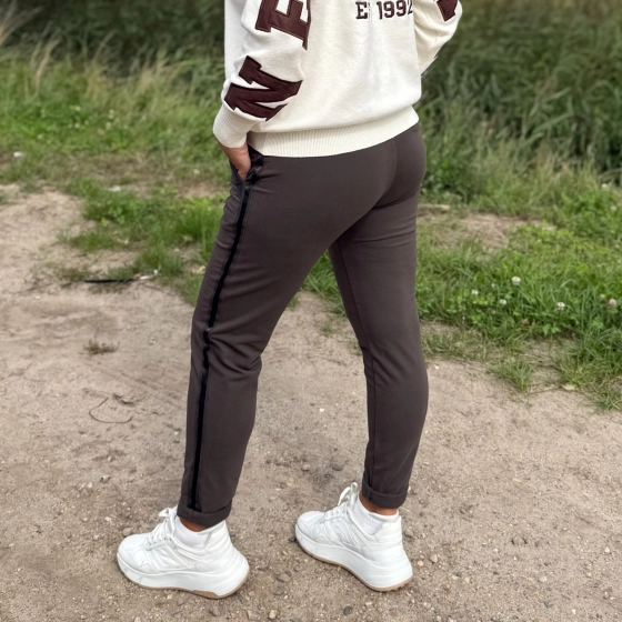 De Gemma Ricceri Sweatpants Mila in bruin is dé perfecte mix van stijl en comfort! Deze trendy jogger van het populaire merk Gemma Ricceri heeft een sportieve uitstraling door de subtiele biaisband langs de zijkant en is gemaakt van een zachte, rekbare stof die heerlijk zit. Dankzij de elastische tailleband met trekkoord sluit de broek mooi aan, terwijl de taps toelopende pijpen zorgen voor een flatterende pasvorm.