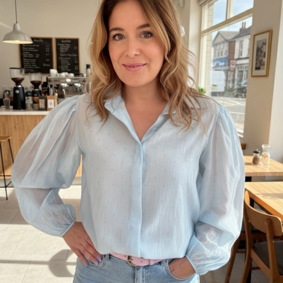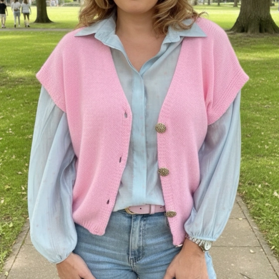 De semi-transparante hartjes blouse van Vera Jo in blauw en roze is perfect voor elke gelegenheid. Met een knoopsluiting en elastische manchetten combineert deze blouse stijl met comfort. Geschikt voor maten S-M en L-XL. Ontworpen voor een trendy uitstraling, veelzijdig te dragen en eenvoudig te combineren. | Trendy design | Comfortabele pasvorm | Geschikt voor diverse gelegenheden.