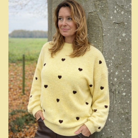 De hartjes trui in geel en bruin is fijn gebreid en voelt zacht aan, perfect voor een comfortabele dagelijkse look. Het materiaal van 50% polyamide, 35% viscose, 10% wol en 5% elastisch zorgt voor een goede pasvorm en duurzaamheid. Geschikt voor verschillende gelegenheden, van casual tot chique. | Zacht en comfortabel materiaal | Fijne pasvorm | Uniek hartjespatroon