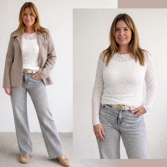 De Ivoor Vera Jo top met kanten details en samengestelde lange mouwen is een elegante toevoeging aan je garderobe. De ronde hals zorgt voor een klassieke uitstraling, terwijl het materiaal van 95% polyester en 5% elastisch zorgt voor een comfortabele pasvorm. Maat SM = 36-38, L-XL = 40-42. Ideaal voor zowel veelzijdige gelegenheden als casual outfits. | Elegant kanten ontwerp | Aansluitende pasvorm | Geschikt voor diverse gelegenheden |
