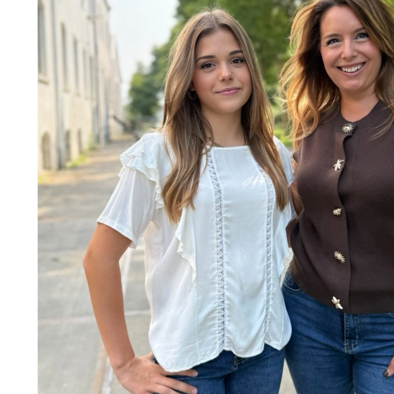 Geef je outfit een frisse, vrouwelijke touch met deze ivoorwitte dames top. De top heeft korte mouwen met sierlijke ruches en een verfijnde kanten inzet aan de voorzijde, wat zorgt voor een romantische en stijlvolle uitstraling.