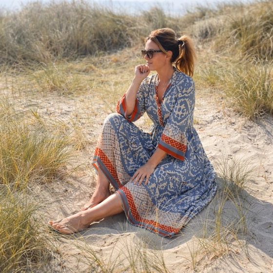 Model op de foto is 1.67 en heeft maat 38, zij draagt Deze jurk in 1 maat: kan gedragen worden van maat 36 tot maat 40.