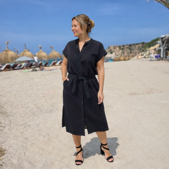 Deze zwarte Azzurro jurk is dé perfecte combinatie van comfort en stijl. Gemaakt van een luchtige stof met een subtiele crêpe-structuur, valt deze jurk soepel om het lichaam. De jurk heeft een volledige knoopsluiting, twee praktische steekzakken en kan zowel met als zonder strikkoord gedragen worden.