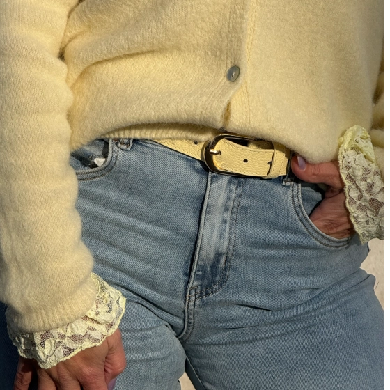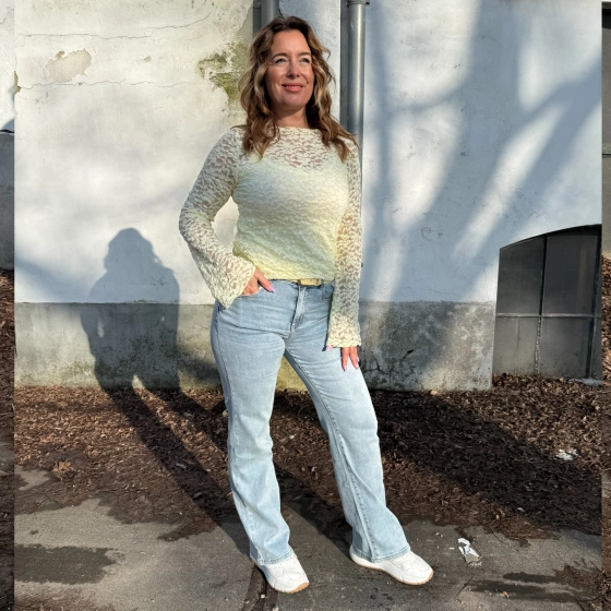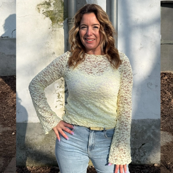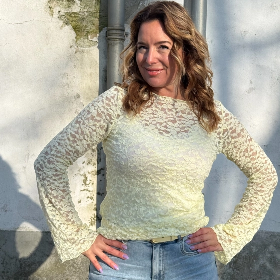 De zachtgele kanten top van Vera Jo met uitlopende mouwen bieden een elegante look voor diverse gelegenheden. Het kant zorgt voor een exotische uitstraling, terwijl de ronde hals en lange mouwen zorgen voor een comfortabele pasvorm. Perfect voor zowel functionele als informele gelegenheden. | Verfijnde uitstraling | Comfortabele pasvorm | Geschikt voor diverse gelegenheden |