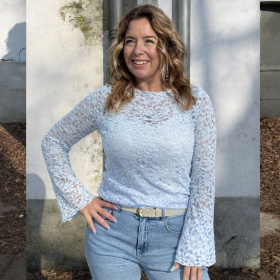 De lichtblauwe kanten top van Vera Jo met uitlopende mouwen bieden een elegante look voor diverse gelegenheden. Het kant zorgt voor een exotische uitstraling, terwijl de ronde hals en lange mouwen zorgen voor een comfortabele pasvorm. Perfect voor zowel functionele als informele gelegenheden. | Verfijnde uitstraling | Comfortabele pasvorm | Geschikt voor diverse gelegenheden |