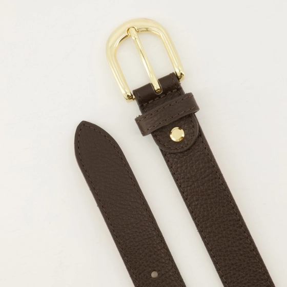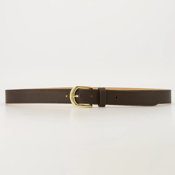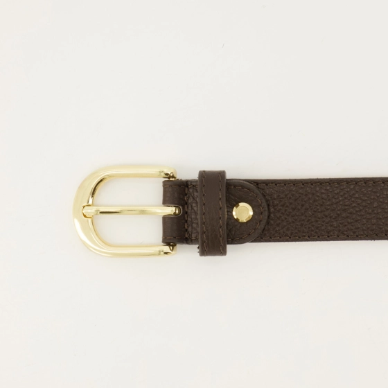 Deze leren riem in donkerbruin met goudkleurige gesp is een onmisbare basic voor elke garderobe. Met een breedte van 3 cm en een klassieke uitstraling is dit accessoire ideaal om te combineren met zowel jeans als pantalons. De goudkleurige gesp geeft de riem een chique en stijlvolle uitstraling, waardoor je look net een beetje extra krijgt.