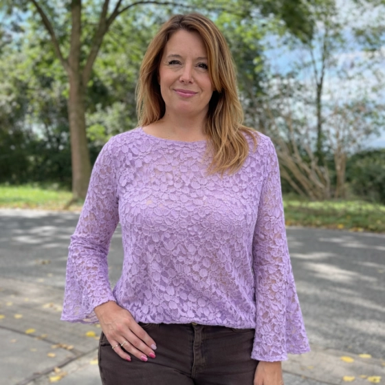 De lila kanten top van Vera Jo met uitlopende mouwen bieden een elegante look voor diverse gelegenheden. Het kant zorgt voor een exotische uitstraling, terwijl de ronde hals en lange mouwen zorgen voor een comfortabele pasvorm. Perfect voor zowel functionele als informele gelegenheden. | Verfijnde uitstraling | Comfortabele pasvorm | Geschikt voor diverse gelegenheden |