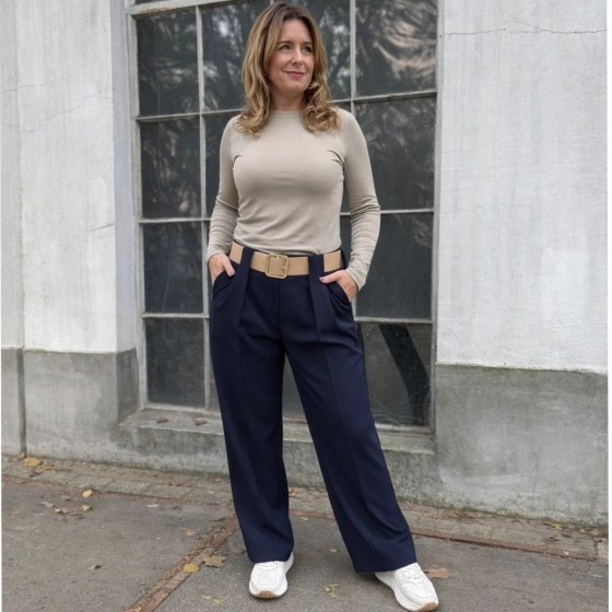 Deze navy pantalon met elegante wide-leg fit is een echte must-have voor wie stijl en comfort wil combineren. De broek valt mooi soepel langs het been en heeft een lange, slanke belijning, waardoor je figuur optisch verlengd wordt.