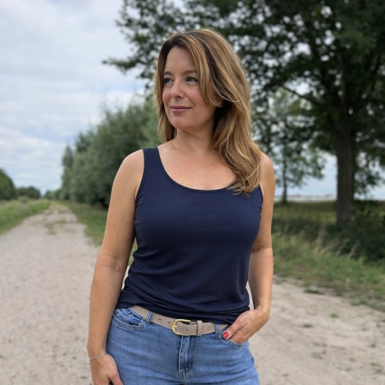 Deze marineblauwe viscose zoom is perfect voor elke gelegenheid dankzij de dubbele voering en comfortabele pasvorm. De ronde hals en mouwloze stijl zorgt voor een tijdloze uitstraling. Ideaal voor zowel casual als functionele gelegenheden. | Dubbel gevoerd voor extra comfort | Gemaakt van 95% viscose en 5% elastisch materiaal | Behuizing in maat SM en L-XL.