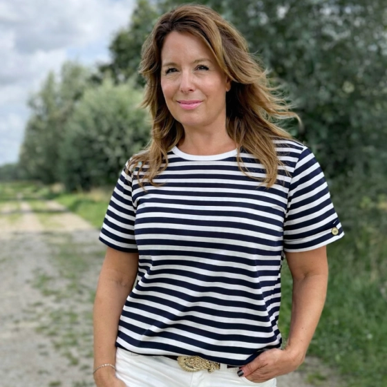 Het Navy wit gestreepte shirt Vivi is een veelzijdig kledingstuk met korte mouwen en een comfortabele ronde hals. Gemaakt van een mix van rayon, polyester en spandex, biedt het shirt een perfecte pasvorm voor maten tot 40-42. Geschikt voor zowel casual als formele gelegenheden. | Comfortabele pasvorm | Veelzijdig te dragen | Hoogwaardige materialen