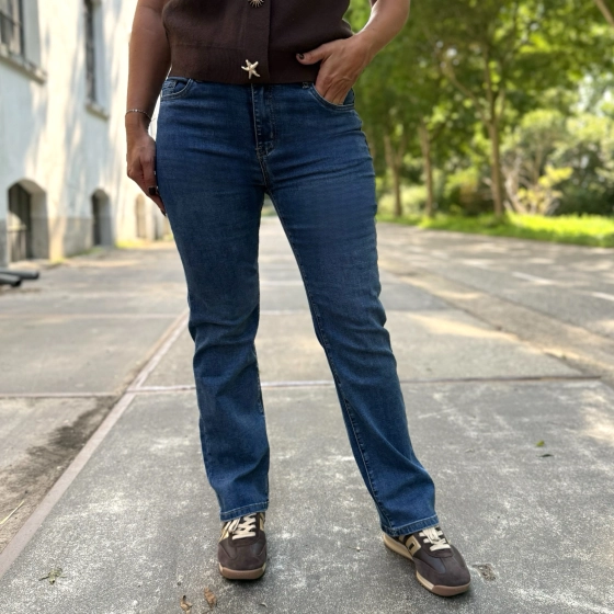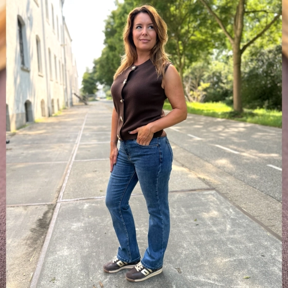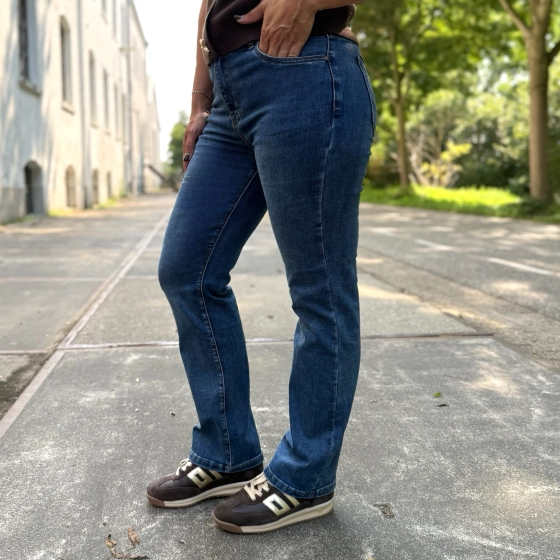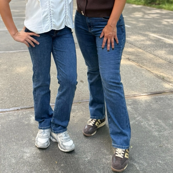 Op de foto zie je Kenza (links) en Adriënne (rechts), allebei in dezelfde fijne Norfy jeans. Kenza draagt normaal confectiemaat 34, maar koos hier voor maat 36. Adriënne heeft normaal maat 38 en draagt maat 40.