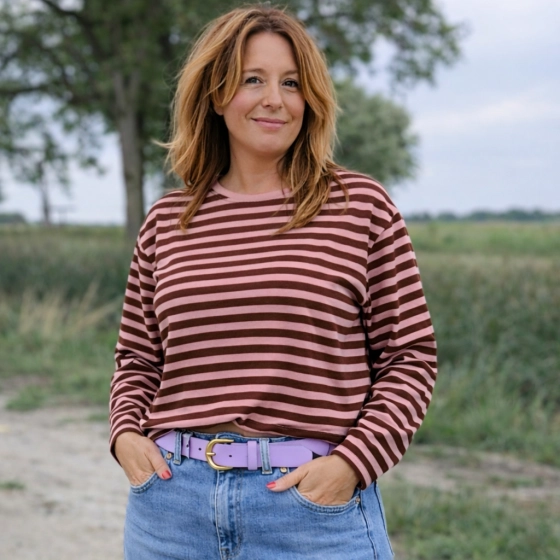 Het oversized streepmotief shirt in bruin en roze van Mooij biedt ultiem comfort dankzij de 80% katoen en 20% polyester mix. De lange mouwen en ronde hals zorgen voor een casual look die perfect is voor diverse gelegenheden. Met de ruime pasvorm geschikt tot maat 42-44 is dit shirt een veelzijdige toevoeging aan je garderobe. | Hoogwaardige materialen | Comfortabele pasvorm | Geschikt voor diverse gelegenheden |
