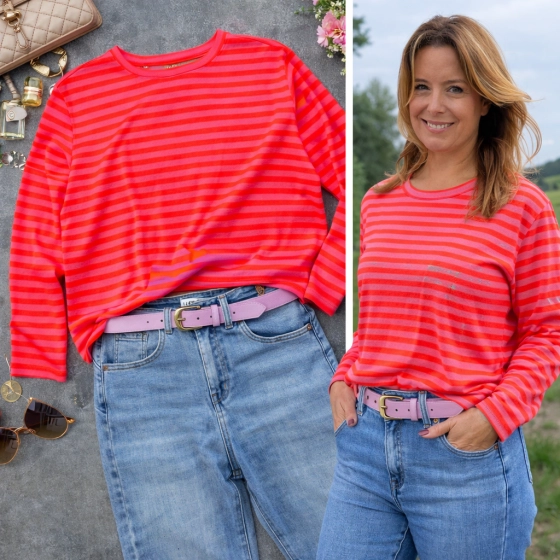 Het oversized streepmotief shirt in lila en koraal van Mooij biedt ultiem comfort dankzij de 80% katoen en 20% polyester mix. De lange mouwen en ronde hals zorgen voor een casual look die perfect is voor diverse gelegenheden. Met de ruime pasvorm geschikt tot maat 42-44 is dit shirt een veelzijdige toevoeging aan je garderobe. | Hoogwaardige materialen | Comfortabele pasvorm | Geschikt voor diverse gelegenheden |