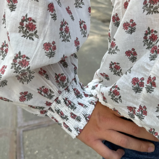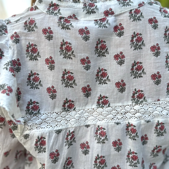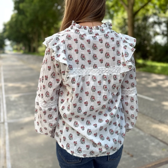 Geef je garderobe een romantische upgrade met deze prachtige bloemenprint blouse. De witte basis met subtiele rode en groene bloemen zorgt voor een frisse, vrouwelijke uitstraling, terwijl de ruches en kanten inzetten een speelse, bohemian touch toevoegen.