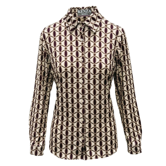De Soft Collectie blouse Stefanie Bibi is een echte musthave voor dit seizoen. Deze damesblouse heeft een stijlvolle retro geoprint met ivoor als hoofdkleur, gecombineerd met taupe, choco en bordeaux. Gemaakt van een comfortabele stretchkwaliteit voelt de stof zacht aan en sluit deze mooi aan. Dankzij de klassieke kraag, lange mouwen en doorknoopsluiting is dit item zowel chic als casual te dragen.