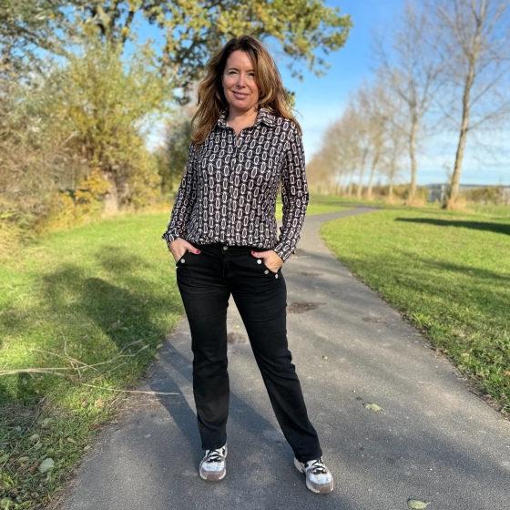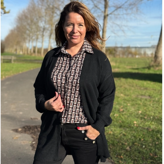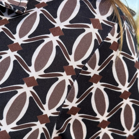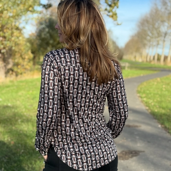 De Soft Collectie blouse Stefanie Bibi is een echte musthave voor dit seizoen. Deze damesblouse heeft een stijlvolle retro geoprint met zwart als hoofdkleur, gecombineerd met taupe en choco. Gemaakt van een comfortabele stretchkwaliteit voelt de stof zacht aan en sluit deze mooi aan. Dankzij de klassieke kraag, lange mouwen en doorknoopsluiting is dit item zowel chic als casual te dragen.