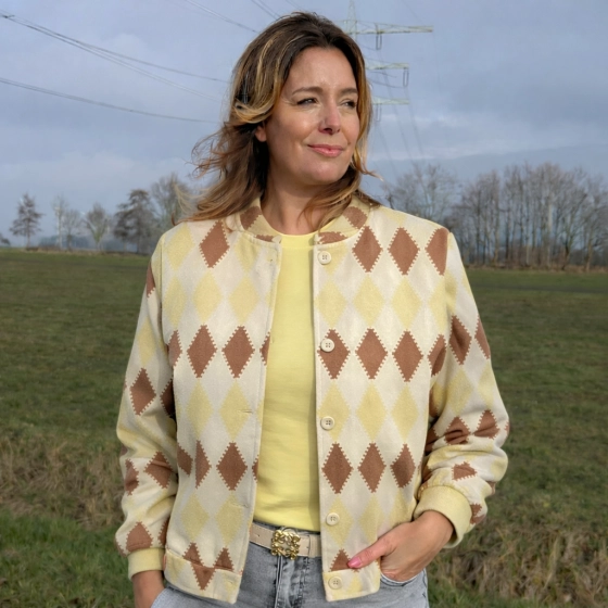 Dit Suedine bomberjack met ruitmotief in de kleur geel is een trendy toevoeging aan je garderobe. Dankzij het materiaal van hoogwaardige suèdine en de knoopsluiting is dit zowel stijlvol als comfortabel. Perfect voor casual gelegenheden en een echte eyecatcher. | Luxe suèdine kwaliteit | Uniek ruitmotief | trui in trendy kleuren geel, Ivoor wit en Bruin |