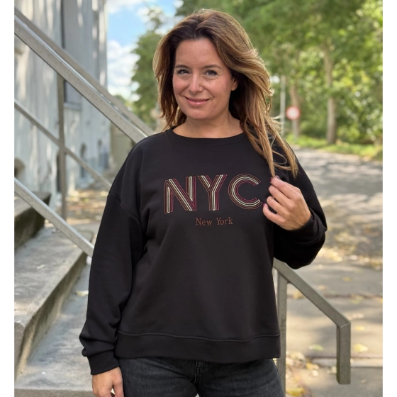 Op zoek naar een trendy sweater dames met een sportieve uitstraling? Deze zwarte sweater NYC is een echte musthave voor het nieuwe seizoen. De trui heeft een opvallende New York (NYC) opdruk in luxe borduursel en combineert comfort met stijl. Dankzij de zachte stof en relaxte pasvorm draag je deze sweater zowel casual thuis als fashionable op straat.