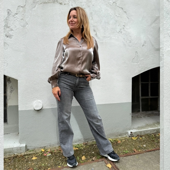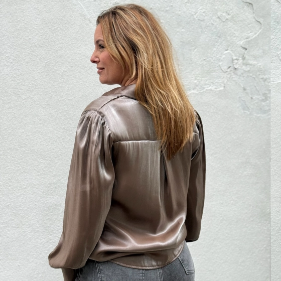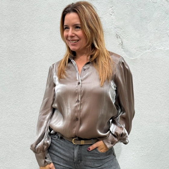 Ontdek de must-have Taupe metallic blouse van Gemma Ricceri! Met knoopsluiting, lange mouwen en een licht getailleerde pasvorm is dit item een echte eyecatcher. Perfect voor de modetrends van de herfst 2025. Beschikbaar in maat S-M en L-XL. Laat je stijl stralen in deze prachtige taupe kleur!