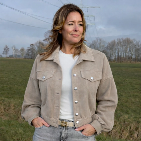 Dit taupe suedine jasje "Liana" is een stijlvolle toevoeging aan elke outfit. Het jasje heeft een klassieke knoopsluiting en is verkrijgbaar in maat S-M en L-XL. Perfect voor zowel casual als formele gelegenheden. | Luxe suedine materiaal | Klassieke knoopsluiting | Verkrijgbaar in twee maten