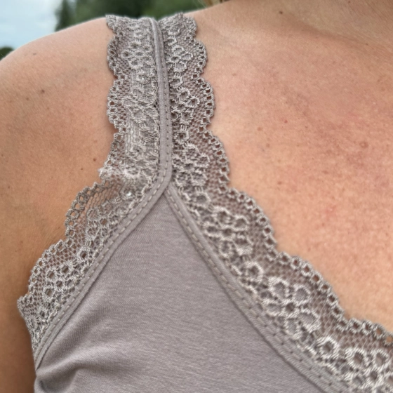 Op zoek naar een taupe topje voor dames dat je eindeloos kunt combineren? Het topje Lieke taupe is een perfecte basic met een elegante twist. Dankzij de kanten bandjes en de zachte stof krijgt dit taupe topje een vrouwelijke uitstraling, terwijl het toch comfortabel en casual te dragen is.