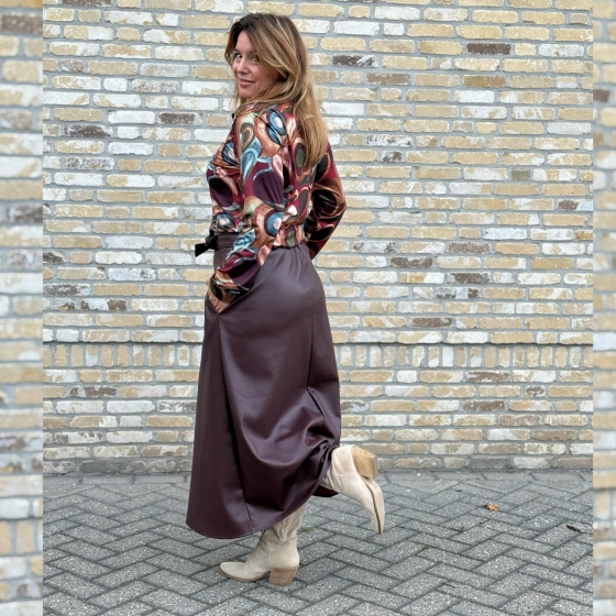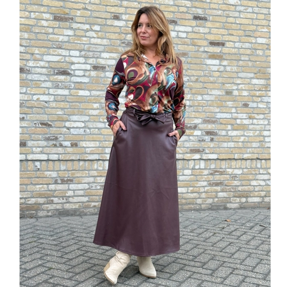 Ontdek de trendy Vera Jo lederlook rok in burgundy! Beschikbaar in maat S-M en L-XL. Laat je verleiden door de dieprode kleur van deze must-have rok van Vera Jo. Deze rok heeft achter een elastische taille, en aan de voorzijde een mooie strik. Deze rok heeft twee zakken. De binnenkant van deze rok voelt heerlijk zacht. Perfect voor een stijlvolle look!