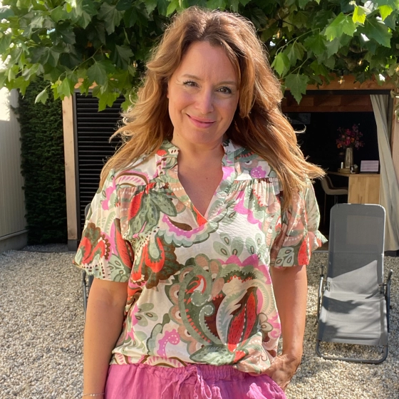 Dankzij de V-hals en licht gepofte mouwen oogt deze top vrouwelijk en speels. Combineer ‘m met een lichte jeans, een rokje of een korte broek en je bent helemaal klaar voor zonnige dagen, terrasjes of vakantie!