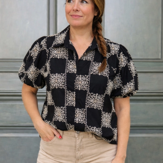 De geborduurde blouse Lilian in zwart is gemaakt van 65% katoen en 35% polyester, met ballonmouwen voor een trendy uitstraling. De blouse heeft een pasvorm die geschikt is voor maten tot en met 40, waardoor het een veelzijdig kledingstuk is voor verschillende gelegenheden. Comfortabel, stijlvol en eenvoudig te combineren | Trendy ballonmouwen | Geschikt voor maten t/m 40 | Veelzijdig te dragen.