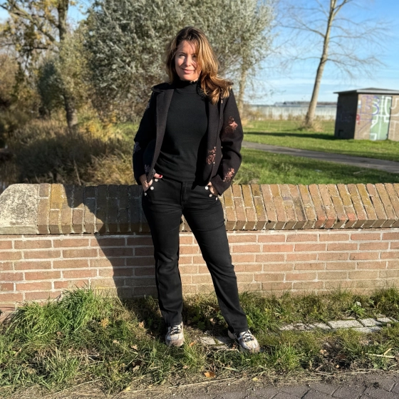 Model op de foto is 1.67 en heeft maat 38, zij draagt deze blazer aan in maat M