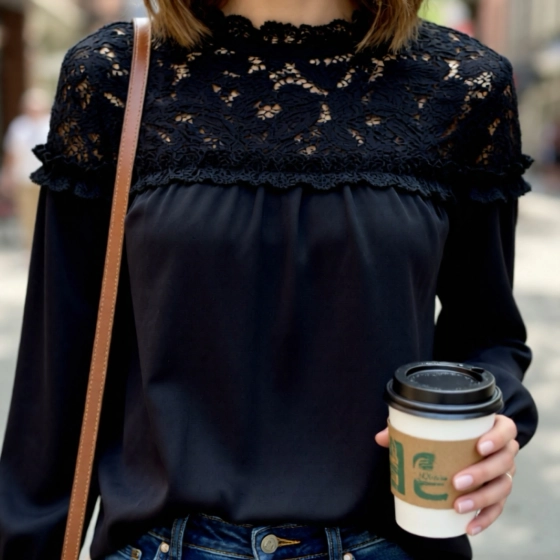 De zwarte top met kant en ruches is perfect voor een chique gelegenheid. Het kledingstuk is gemaakt van 95% polyester en 5% elastisch materiaal, in de top zit geen stretch. De lange mouwen en elastische manchetten zorgen voor een goede pasvorm en extra elegantie. Ontdek de unieke eigenschappen van deze top: kantdetail, ruches en elastische manchetten. | verkrijgbaar in maten SM en XXXL, zie de maattabel voor de juiste maat | Gemaakt van hoogwaardige materialen | Geschikt voor diverse gelegenheden.