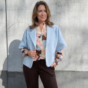 Ontdek deze stijlvolle Shop the Look met bruine broek met naad, kleurrijke print blouse en lichtblauw wollook jack. Een comfortabele en modieuze combinatie die perfect is voor elke dag. Bestel deze complete set eenvoudig online en profiteer van gratis verzending.