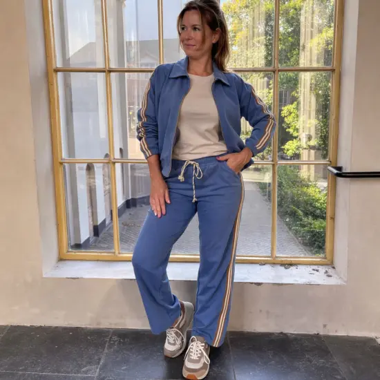 Ontdek dit stijlvolle 3-delige dames pak van Chastar met sportieve bies, gecombineerd met een dubbel gevoerd basic beige shirt. Een comfortabele en trendy set in rafblauw die perfect is voor elke dag.